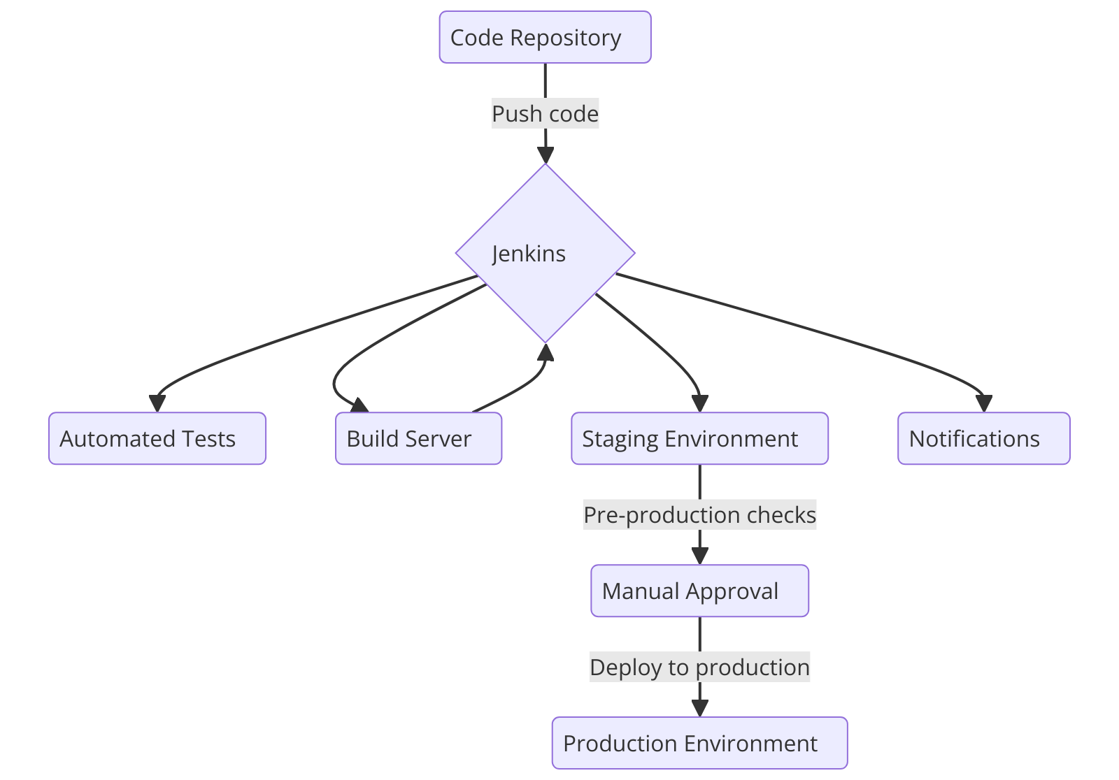 Jenkins также важен для непрерывного развертывания (CD). После того, как сборка прошла необходимые тесты, Jenkins может автоматизировать развертывание этого кода в различных средах — будь то стейджинговая, производственная или любая промежуточная. Это делает его центральным инструментом для DevOps и разработки сборок, помогая командам поддерживать стабильный и эффективный конвейер от разработки до производства.