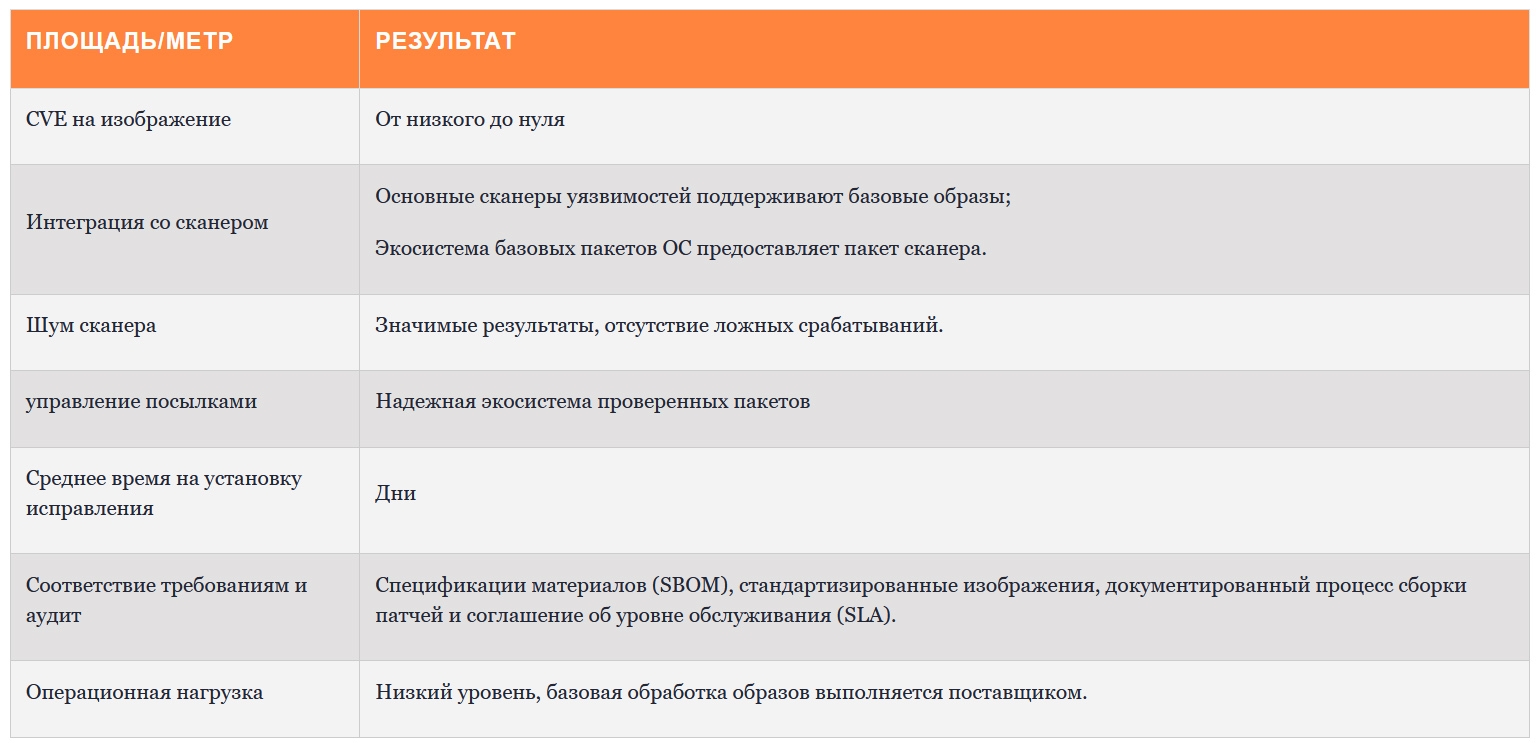 - Когда появляется критическая уязвимость CVE, поставщик обновляет защищенный образ, вы перестраиваете свой образ на его основе, и группа безопасности закрывает заявку — теперь за несколько дней вместо недель.
